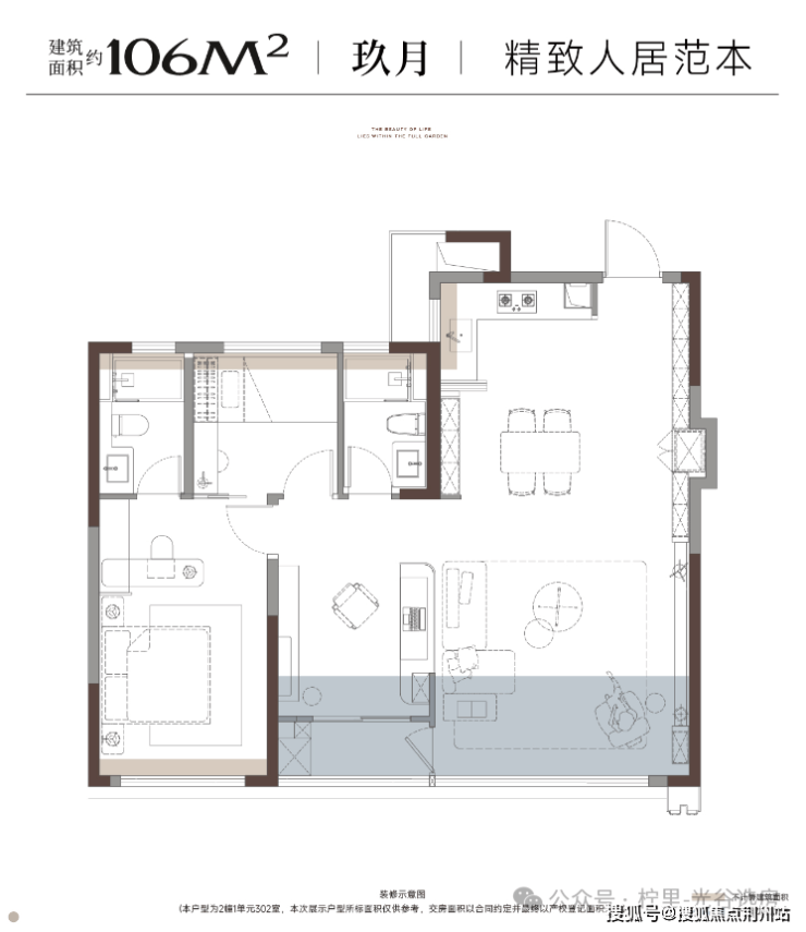 建面约106㎡的三室两厅两卫,约57㎡LDKB一体化宽厅,在有限面积内做出横厅感,搭配超强收纳系统,是高性价比优选。