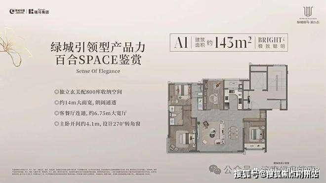 143㎡三/四室:独立玄关+800库收纳空间;约14米面宽;客餐厅连通,约6.75大宽厅;主卧开间约4.1米,带270度拐角落地窗。缺点是有两个北卧。