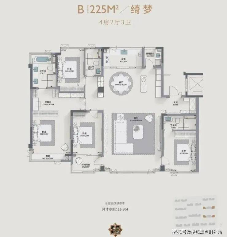 建筑面积约225平 4房3卫