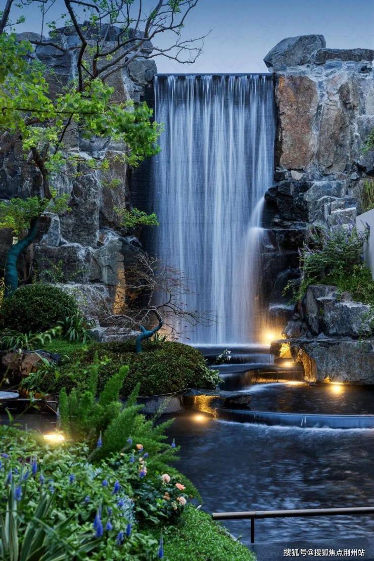更惊艳的是,九庐还打造了“三重叠水”,约6米高差瀑布,潺潺流下,非常震撼,飞瀑两侧是近200吨山西黑天然石材,瀑布上游设计一片约500㎡的镜面水景,影随景动,让人一眼沦陷。