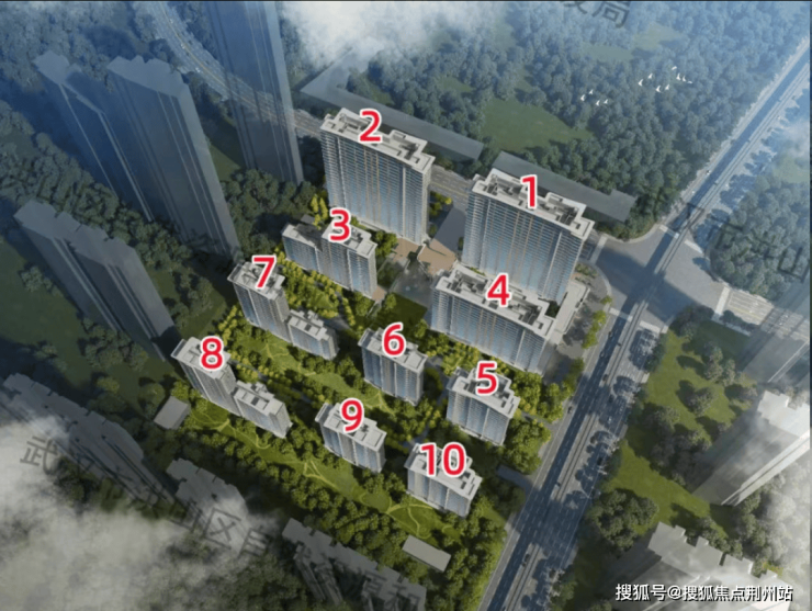 该地块非常方正,北侧和东侧为道路。所有楼栋为南北朝向。楼间距约34.6-43.6米。1、2号楼为26层的高层,3、8号楼为11-17层(两个单元高度不一样,4、5、6号楼为17层,7号楼为9-17层,9、10号楼为15层。外立面比较统一,或为封窗交付,估计为高得房率的准四代。该项目西侧为保利新武昌K6高层,南侧为复地悦城高层,对于8、9号楼采光影响不小。