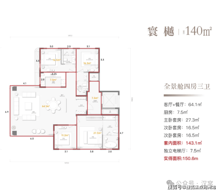 7号楼小高层为两梯两户布局,2个单元,主打140平米四房三卫(全景舱+方厅设计),与一期产品一样,区别在于二期7号楼另有8套城市平墅,算是一个新品;