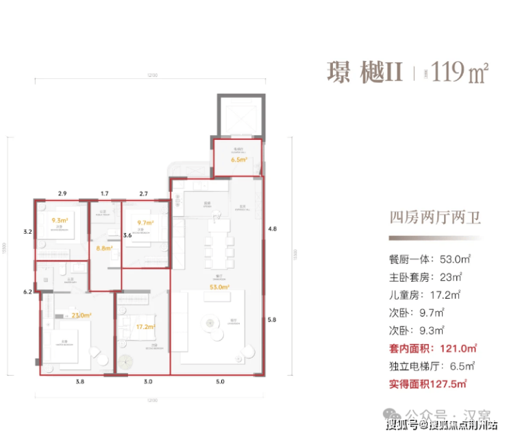 建面约119平,实得面积约127平,得房率约106%。南北通透三面采光的边户,独立电梯入户,同样也有独立电梯前室可以利用。