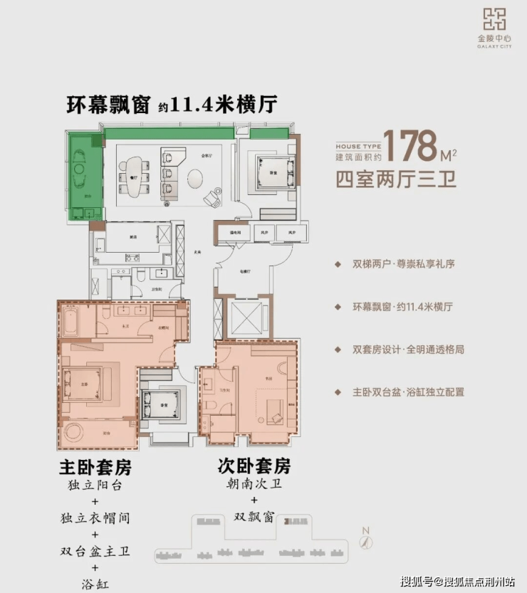 建面约178㎡户型,四房两厅两卫+约11.4米的270°环幕横厅+南向双套房