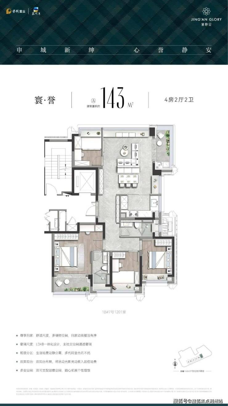 作为上海首批“好房子” 新规落地范本,「誉静安」未止步于单一标准的复刻,而是深度贴合上海高端家庭需求,开创性打造 3.5 代宅,其约 143㎡宽奢四房堪称 “空间教科书”——