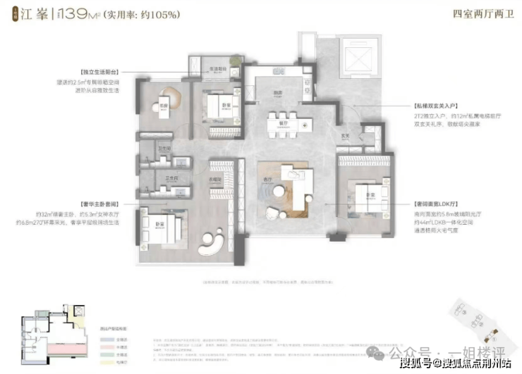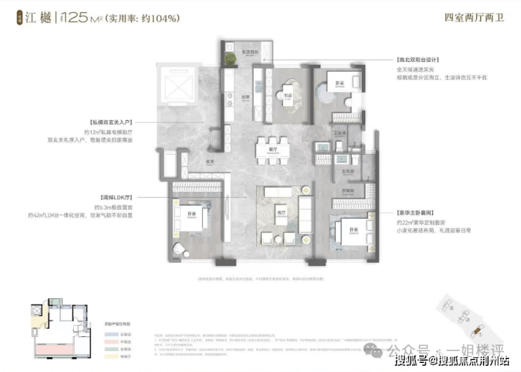 从户型图来看,实用率约105%,北侧卧室带有生活阳台,客厅开间更大,主卧拐角飘窗,主卧面积约32平,整体空间尺度都更大一些。