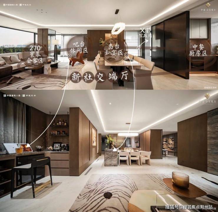 为什么我说是新社交端厅,一方面,客厅拉通L型阳台设计,270°寰幕视野,横向观景面约10米,双面采光,叠加约3.3米的层高,格局打开;另一方面,270°寰幕客厅区+吧台休闲区+岛台私宴区+中餐厨房区,创造了新场景。