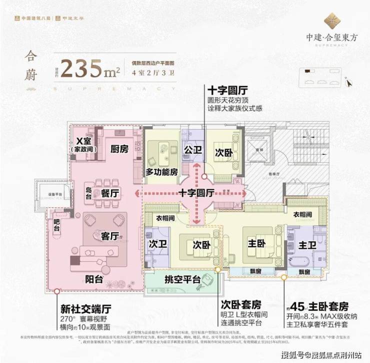 要知道,无论杭州还是南京,能加载十字圆厅的产品,基本得有300-400㎡。而中建合玺东方,用建面约235㎡就做到了。