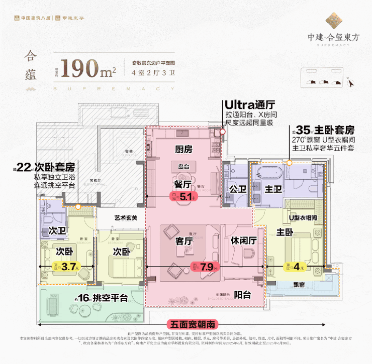 而中建合玺东方三房业主,拥有的则是开间约7.9米的Ultra级客厅,阳台拉通设计后尺度更甚。对的,你没看错,这款产品能三房,也能四房。