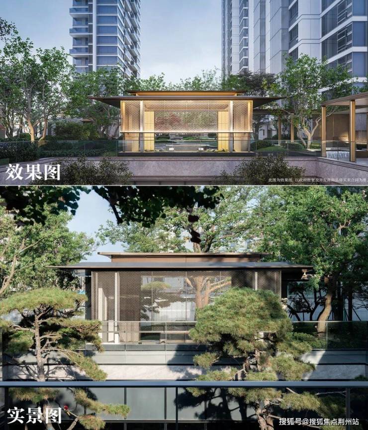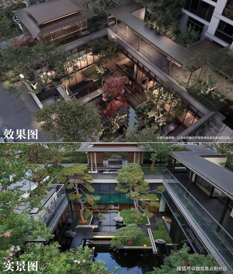 再看下沉式庭院,水景、廊架、廊亭等均对本就很不错的效果做了更高程度的还原。但中建合玺东方并不满足于1:1还原,而是大力度提升优化,让来自全国的名木、全球的奢石和石材,成为业主楼下的好风景。