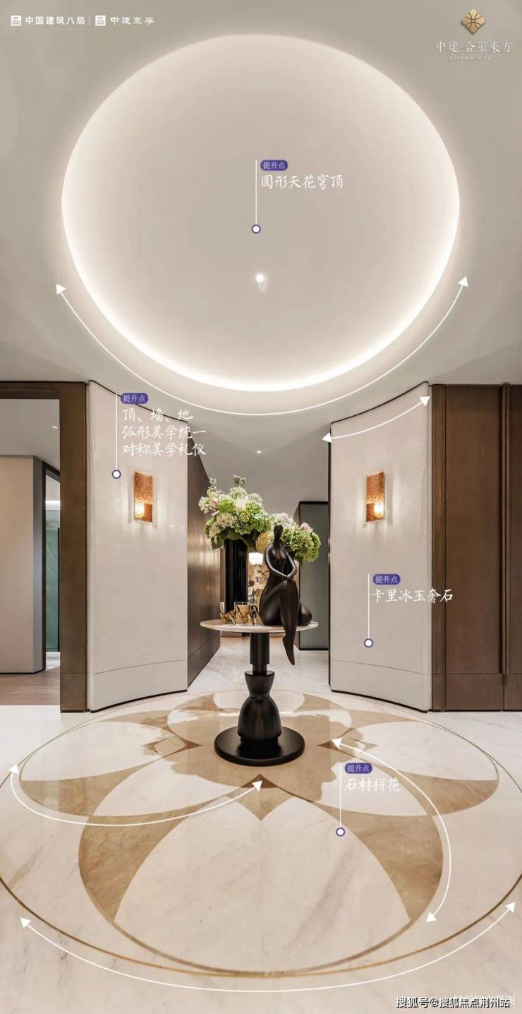 但高气质兑现,中建合玺东方一点都不简单,从顶到墙再到地的弧形、对称美学的统一,卡里冰玉奢石、石材、木饰面等材质的绝妙搭配,石材拼花的气质出众,全局高能。
