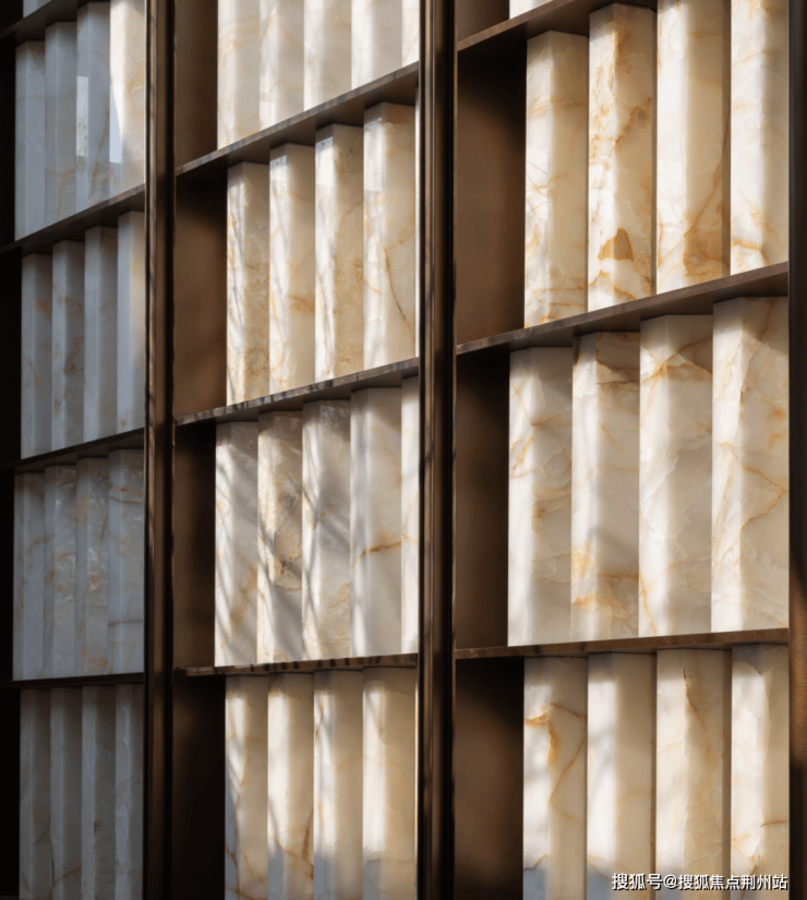 地下会客厅的香格里拉冷翡翠奢石吧台;地下光厅的透光云石;