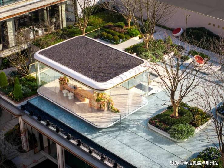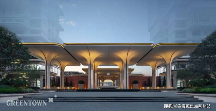 项目主入口,八棵高度约8米的“长安玉树”与贝金米黄石材、长安红陶板相结合,形成优雅的入口形象。两棵冠幅宽约10米、树龄约百年的桂花树阵列左右,营造出浓郁的归家氛围。