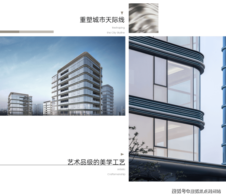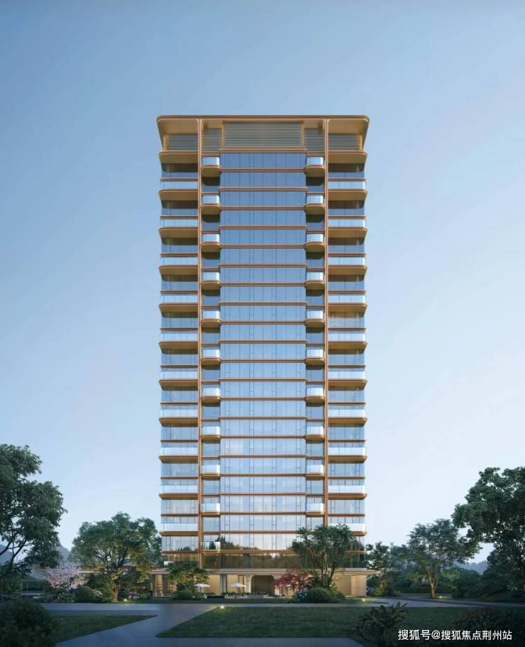 立面以香槟金金属线条勾勒轮廓,在光线下流淌出琥珀般温润光泽。这一暖色系的介入,既延续了“月华系”的现代基因,亦赋予建筑罕见的亲昵感。标志性的曲面屏设计通过取消转角结构柱,实现270°观景视野,达成视觉的无界延伸。大面积陶板材质的运用,以其比铝板更丰富的光影、比石材更灵动的质感,与香槟金线条共构出立面的温度与深度。
