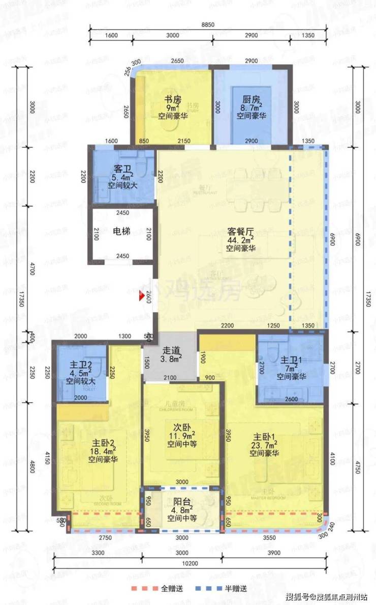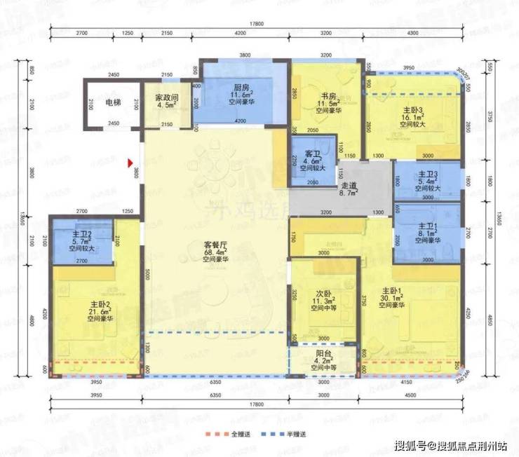 ❸高层建面约170㎡B2户型,4房2厅3卫,含赠送得房率约87%。