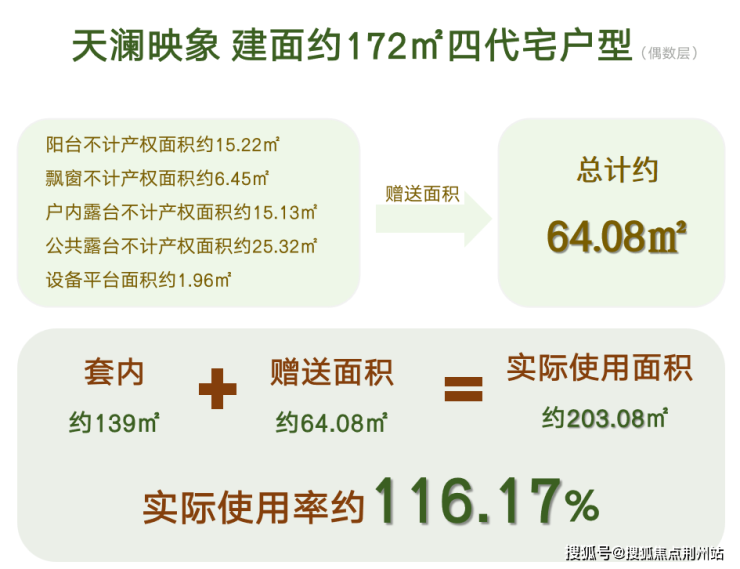 以建面约172㎡偶数层户型为例,据测算,阳台、飘窗、露台等多处赠送面积高达64.08㎡,相当于一套大两房的实用面积!
