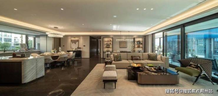 再如建面约289㎡的大平层户型,一层一户双电梯配置,南向约22.85米的奢阔面宽,360°环幕光景。LDK一体化的阔厅,搭配大尺度阳台,构筑超百平奢阔空间,侧向则是规划时特意让渡的约30米宅间景观,实现开阔的层峯视野。