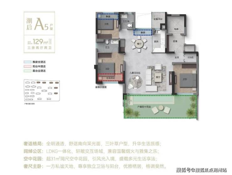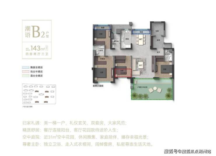 建筑面积约143㎡(中露台)户型也同样亮点满满:人性化的双套房三卫设计,贴心礼遇让生活优雅从容;南向多功能空间,可单独成为卧室,也可与客厅打通,直接成为大横厅,瑜伽区、影音室等随心切换;约14.6米南向大面宽,引风光入室,涵养幸福生活。