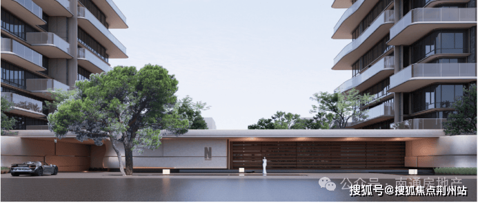 【40米规格门仪酒店式落客】门头如画卷般横向展开,虚实结合,形成强烈的视觉冲击力与领域界定,入口不设传统围墙,转而以高低景墙、密植乔木与城市界面形成 “软边界”。