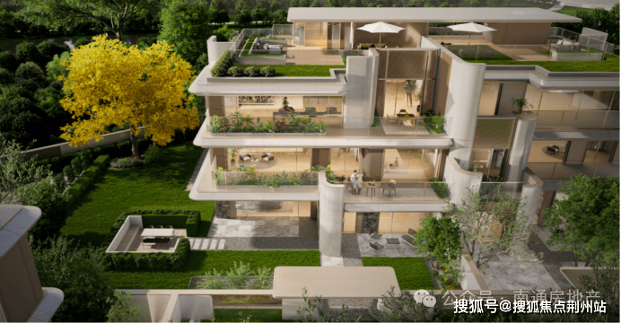 【层层退台花园一户三面景观】双拼别墅建筑以梯田式退台结构呈现,每层均配置私属空中花园,每一户独享三面花园亲地性景观;