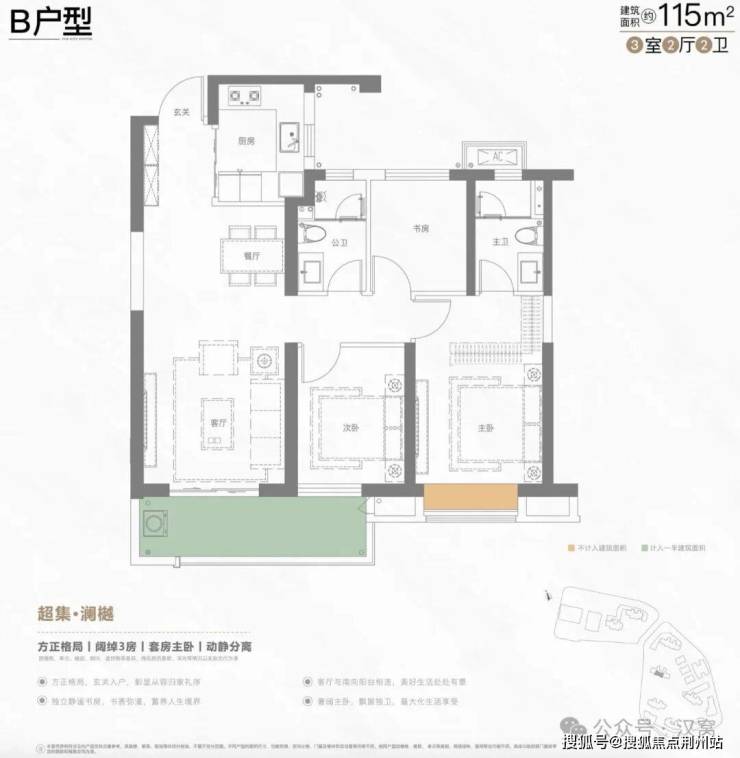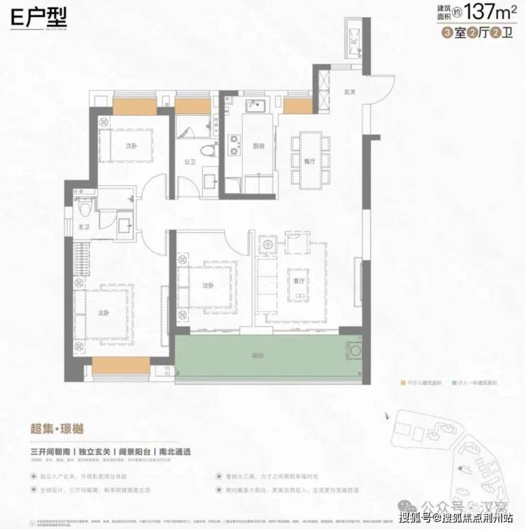 北向餐厅、双次卧、卫生间均带飘窗,可利用率较高;南向主卧套房设计,带独立卫浴、衣帽间、飘窗,兼具功能性及私密性。