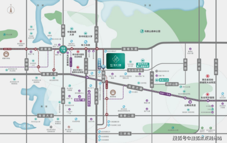 这个盘的位置很绝——光谷创业街上,唯一的新盘。离地铁2号线佳园路站只有约600米,离华科校园和马鞍山森林公园也就900米左右。
