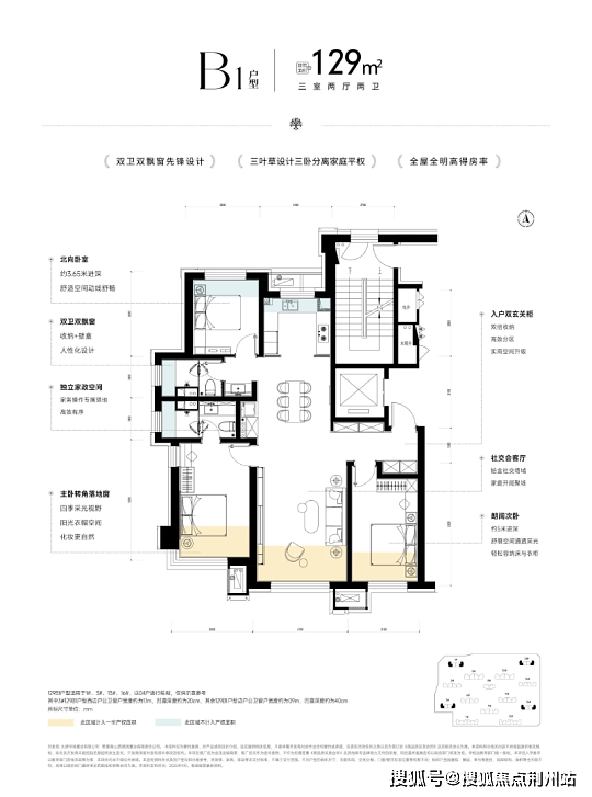 产品品质:以“六维超感满配社区”为标准,打造高颜值建筑、全龄友好社区、高得房率户型及鲸吞收纳系统。项目开盘的三种户型,120㎡/129㎡(得房率90%左右)、143㎡(得房率88%左右),全系三叶草户型,注重家庭平权和居住体验。