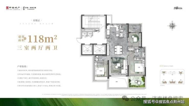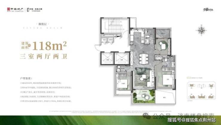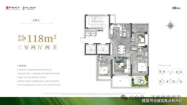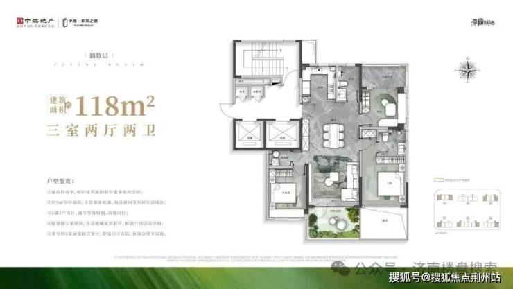 ①约96%得房率;②2T2户私梯入户,独立电梯厅;③独立玄关配家政间;④约17㎡空中花园,约6米挑高;⑤约5㎡设备平台,预留水电位;⑥客厅/主卧/南次卧落地窗;⑦约28㎡超大主卧套房,配备衣帽间;⑧方正U型厨房,合理分区。
