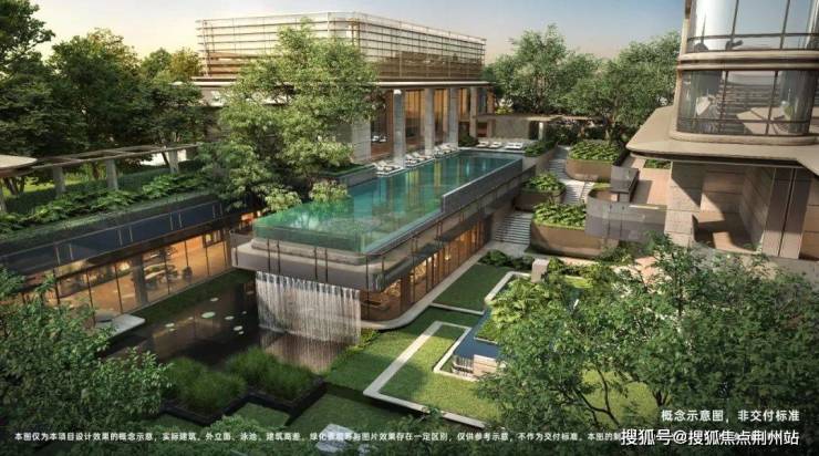 约12米高差架空设计,创作双首层庭院景观,让水景、水池、错落有致的阶梯绿化与室外配套设施、架空层、建筑小品等元素巧妙融合。步入社区空间,视觉体验非常丰富。