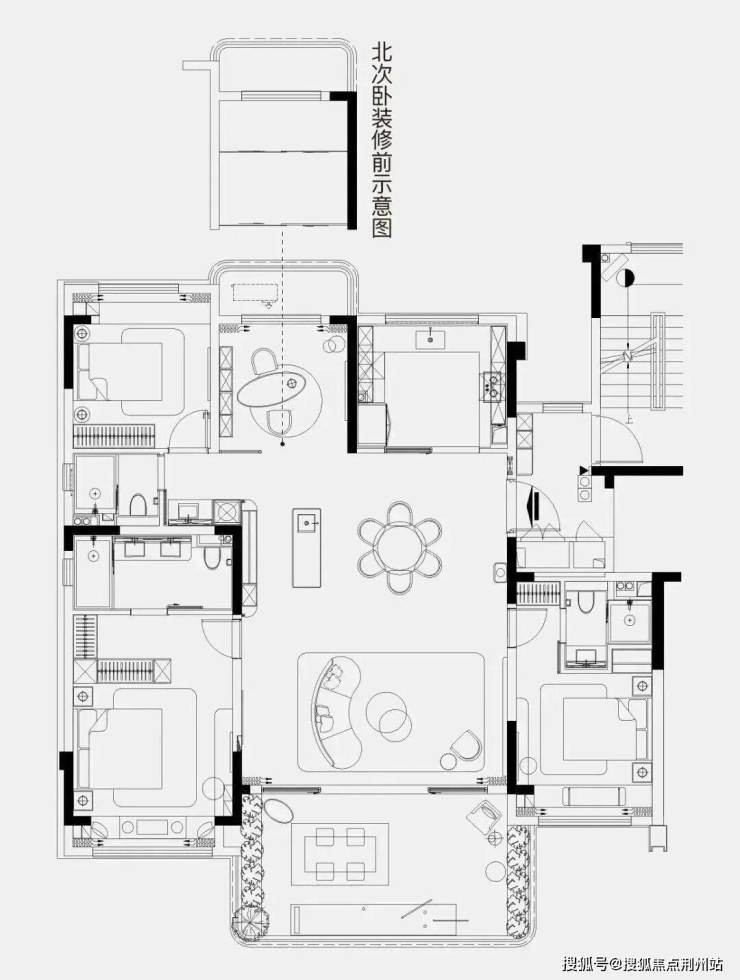 4房2厅3卫布局,三开间朝南,其中两个套房主卧,一个约45平的宽厅连接南向阳台,该户型的花园露台足足23平。