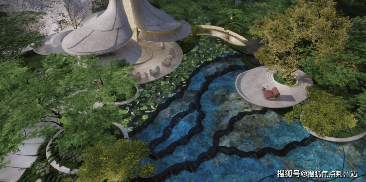 大堂中庭水景移植九寨黄龙彩池奇观,实现兼具自然野趣与艺术美感的绝妙空间。同时,整个小区内部水景系统总面积约2200平,规模之大开创了武汉先河。