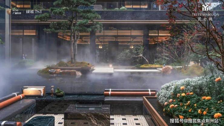 会所窗外就是下沉式庭院,大面积的镜水之上伫立着双杆黑松、赤松、油松。售楼员说,这三颗松树寓意「福禄寿」,代表着产城和绿城对业主的美好祝福
