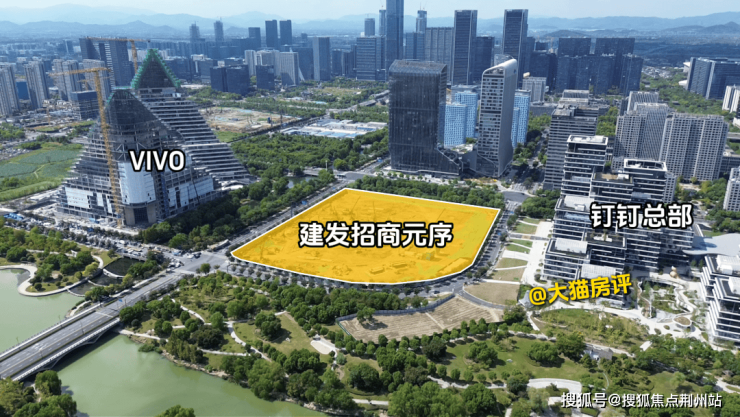周边邻近钉钉总部、VIVO等,南面是绿地公园、河道,居住环境其实还可以,实景航拍时间是25年8月底。
