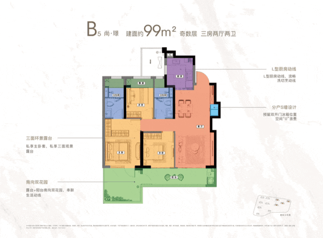 保利·国贸璟上户内空间使用率超100%,如此高的利用率,直接带来了尺度上的越级,比如建面约99㎡客厅开间约3.5米,其中奇数层还带约6.25米的双联阳台;
