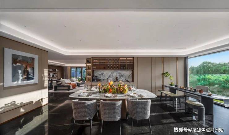 因而,在建面超4 0 ㎡的 260 ㎡大平层餐厅空间,江山万里精心嵌入了一个茶室区,创造了一个堪比「 会所级」 的餐厅社交空间。