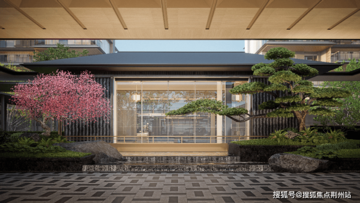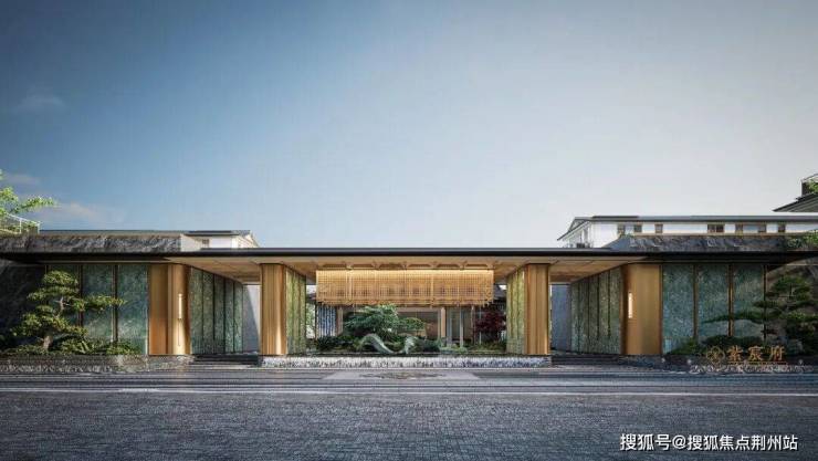 主入口采用酒店落客式手法,汲取衢州书院文化气质,打造院落式归家大堂,一进景观院落面向城市空间打开,犹如一幅展开的山水长卷,端庄大气。材料上通过石材和铝板及格栅的运用,搭配景观绿植,在近人尺度上体现精致典雅的东方气质。
