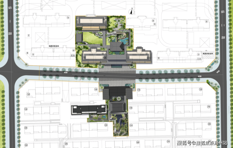 项目地块初始条件分为了南北两块,设计依托这一特性,在地块核心位置打造中心示范区,将南北两个地块有机串联,形成两大居住片区的配套核心。