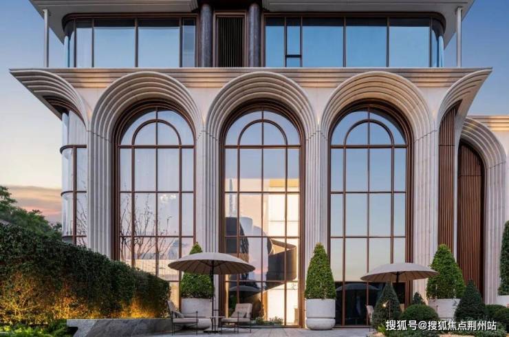 古铜色金属线条化作现代幕墙的横向分割线,270度曲面玻璃的转角,又延展出仿石铝板罗马柱,让古典美学在当代复兴。