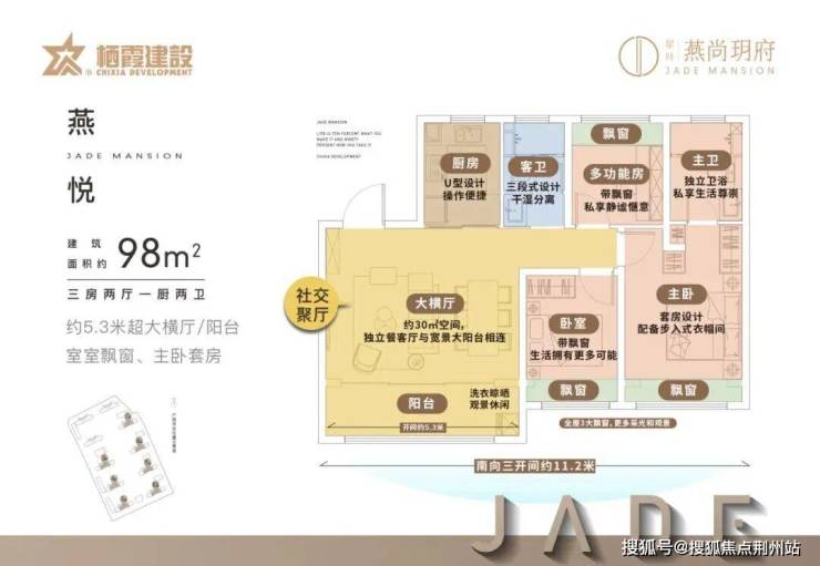 面积约98平户型三房两卫的同时,也有约5.3米的横厅!