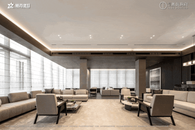 中心景观区,打造无界会客廊架,周边还有大面积的水景,试想下坐在会客区静静听着潺潺水声,整个人都能放轻松,松弛感拉满。