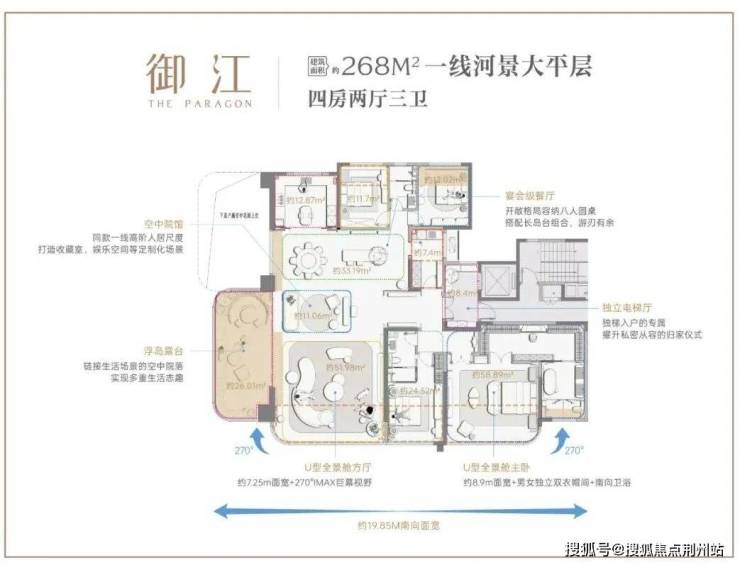 项目创新打造270°迭代双面端厅,整个客厅面积达51.98㎡,搭配约7.25m超大面宽,3.3米的层高,带来超常规空间体验与视觉突破。