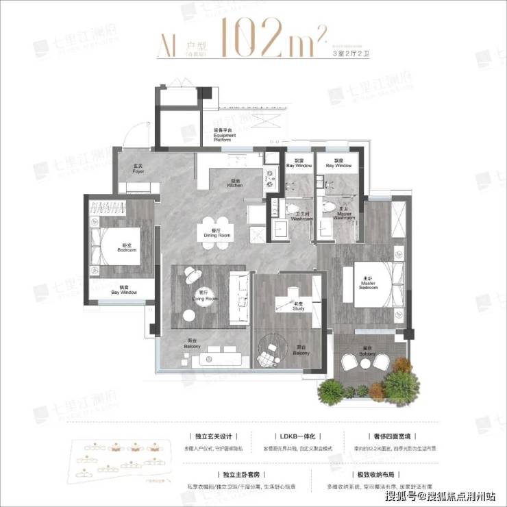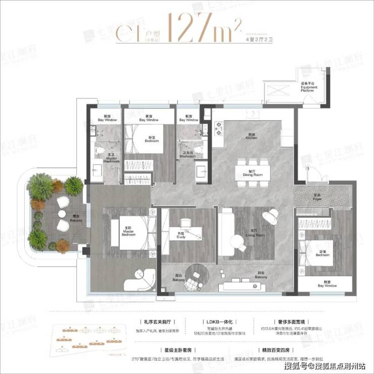 ③ 空间创新:七里江澜府创新打造浮岛立体错层露台,通过科学布局,一户一露台,有效规避上层遮挡,更大程度保护了私密性。