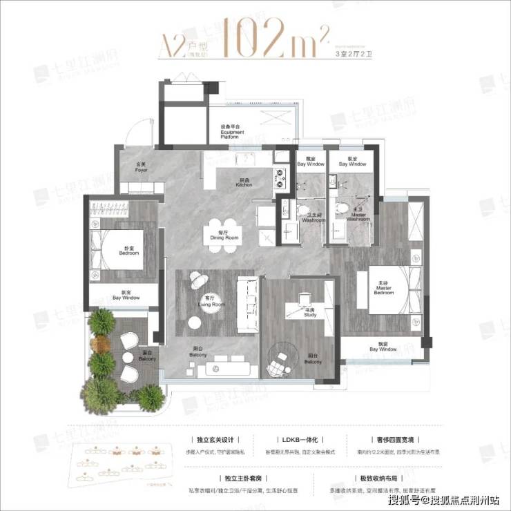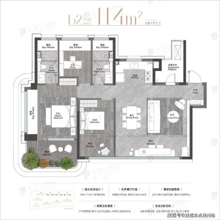 另外,还有建面约114㎡三房两厅两卫户型,是三房户型里更舒适版——四开间朝南,南向超12米南向景观面,一线瞰河。值得关注的是,这个户型延伸了更多空间,非常实用。比如独立家政间,巧妙化解家政收纳;全飘窗设计,既放大视觉体验,又将高附赠率拉满。无界横厅设计,可以设置成多个多功能空间,全方面满足家庭成长需求。主卧大套间,带有独立卫生间,270°观景面,比起102㎡改善尺度更大。露台做了主卧空中花园,不占用阳台的独立功能。