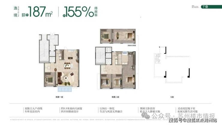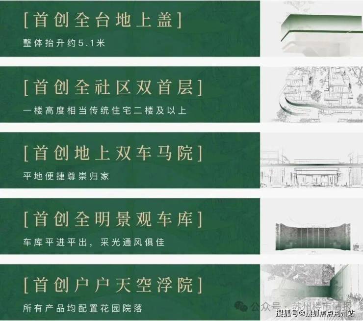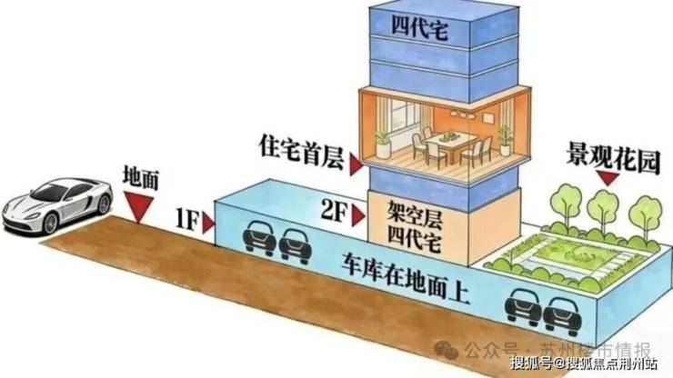 值得关注的是,全域抬板设计在苏州尚属首次实景落地,并创新设计地面车库+架空层联动,结合贯穿社区的风雨连廊,真正兑现“无风雨归家”体验。