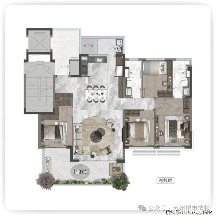 该空间契合苏州新政中“空中庭院不计入容积率”的规定,可灵活改造为花园、茶室、儿童游乐区等,丰富使用功能。