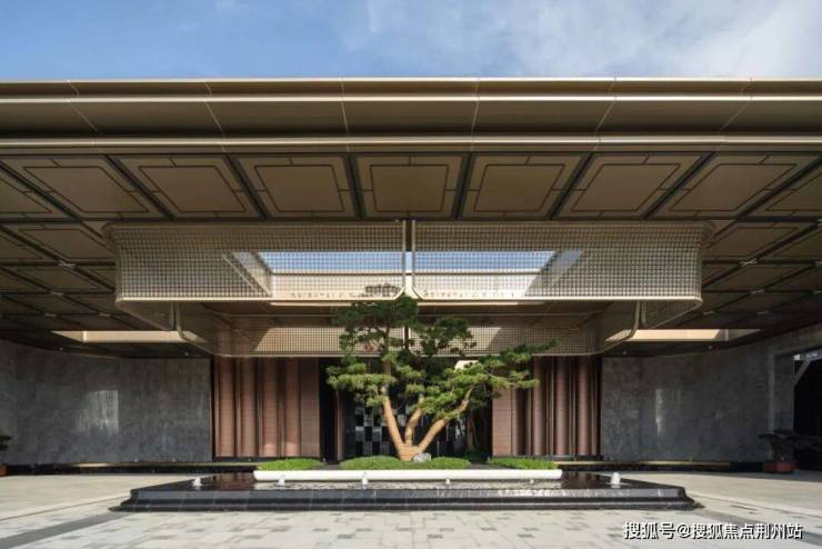 设计注重细节的温润与精巧。立柱以石材为骨,纹理细腻而富有层次;檐下金属格栅精心打磨,线条简练中暗含苏式窗棂的韵味。雨棚挑檐边缘以隐形灯带勾勒,夜间光影柔和,既点亮归家的路径,又烘托庄重氛围。门扉转角处嵌入精致的铜质饰件,既起到收边过渡的作用,也让传统匠心在现代工艺中延续。水景与绿植环绕入口,使硬朗的建筑细部在自然的映衬下更显雅致,步入其间,细节即是礼序。