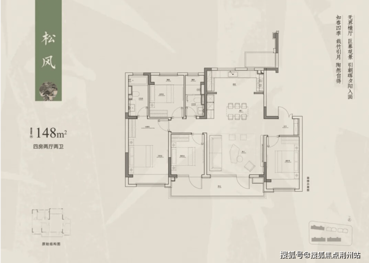 先看洋房产品,标准层建面约148㎡,打造四房两卫+三开间朝南格局。