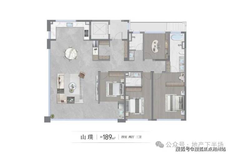 建面约189平四室两厅三卫户型,堪称同面积段里“天花板” 般的存在。它采用真正的一梯一户设计,一个单元仅规划一户,专属电梯厅带来的私密感与尊贵感,以往只有200平以上的大平层才能实现,相较常见的两梯两户产品,尊贵感大大提升。