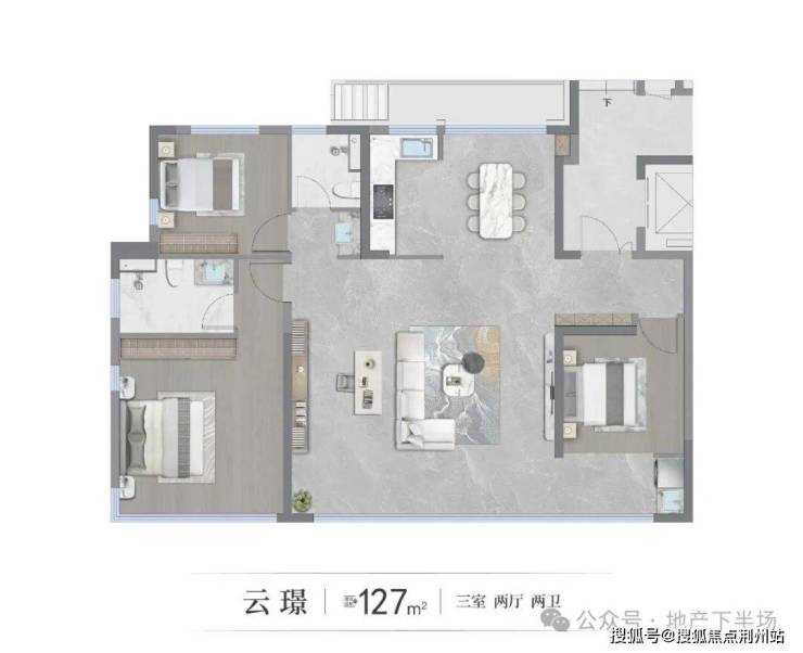 建面约127平三室两厅两卫,虽是入门户型,却有着“越级”的空间表现,客厅尺度达到了约6.3米,南向双阳台尺度达到了约9.3米。