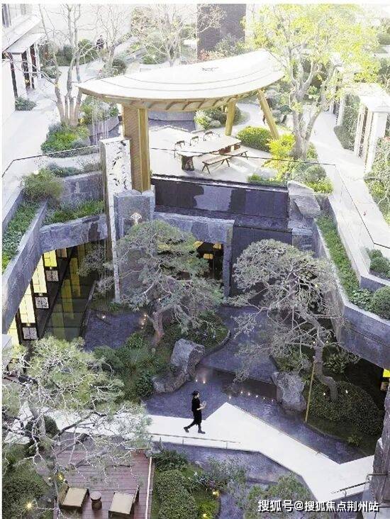 开发商打造了大面积水景,通过镜面水景、悬浮树池、叠水流瀑的组合,将归家的仪式感拉满。而进入悬浮的大堂之后,如同纪念碑谷一般的下沉庭院像是一个大型景观秀场。整个庭院高差近10米,如同在一座立体花园中探秘寻宝。